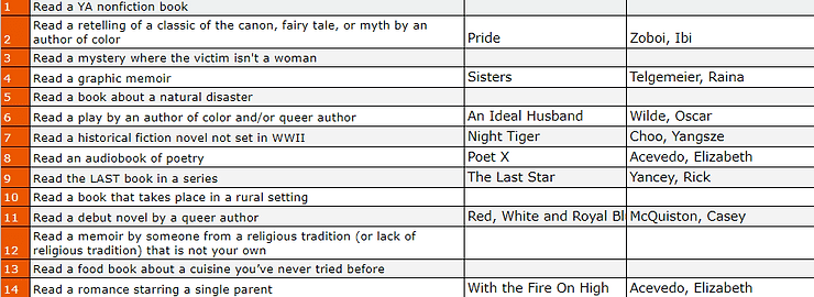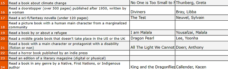 If you want to know, I used Book Riot’s spreadsheet each year and I tweek it to my own liking. CLICK HERE <– if you would like to see their 2021 spreadsheet.