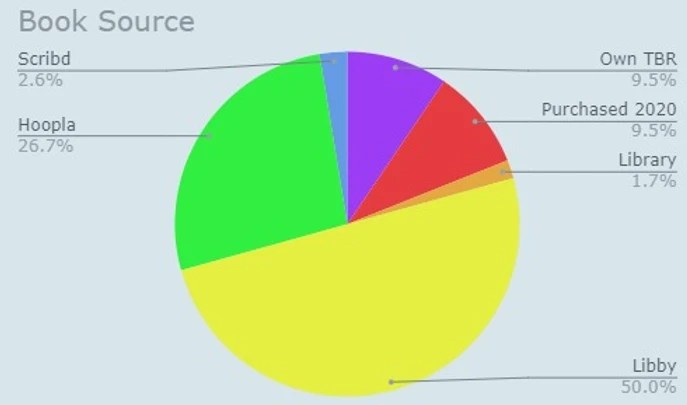 My biggest source of books was Libby. I really want to stop reading so many audiobooks in 2021. Altogether, this would put 79% of my reads as audiobooks from Libby, Hoopla and Scribd, except maybe 2 ebooks I read on Hoopla. I discovered audiobooks in 2019 and they kind of took over my life in 2020. I love audiobooks, but I want to read more physical books in 2021. Even the books that I bought in 2020, I still listened to an audiobook for most of those. For the one that says Library, this just means I got a physical copy of the book from my library, as all the books from Hoopla and Libby are also from the library.