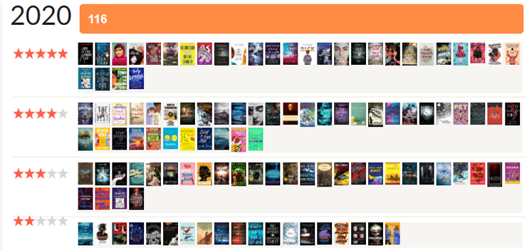 In 2020, I read 116 books along with 38,932 pages. Here is a graphic of all the books I read in 2020 and what I rated them. Another interesting bit is that I haven’t rated a book 1 star since 2018. A book has to be really offensive to get a 1 star review. I try to steer clear of anything that I might give a 1 star review. My average rating was 3.7. Every year previous, it has been 3.9. I have rated more books in 2020 2 stars than ever before, but I really stepped out of my comfort zone in 2020, and I can’t regret that.