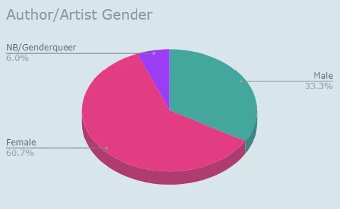 This one is an interesting stat. It was exactly the opposite in 2019 when I had 60% male authors. I didn’t flip that stat on purpose and I don’t specifically try to skew this number. I just find the stat interesting. I didn’t even seek out nonbinary authors, it just happened. I am happy to see it!