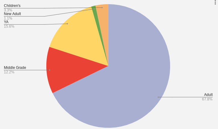 Here is the age group for each book. I am not totally surprised by this chart. I’m finally reaching that age where YA is less and less appealing to me. However, I won’t quit reading it all together anytime soon.
