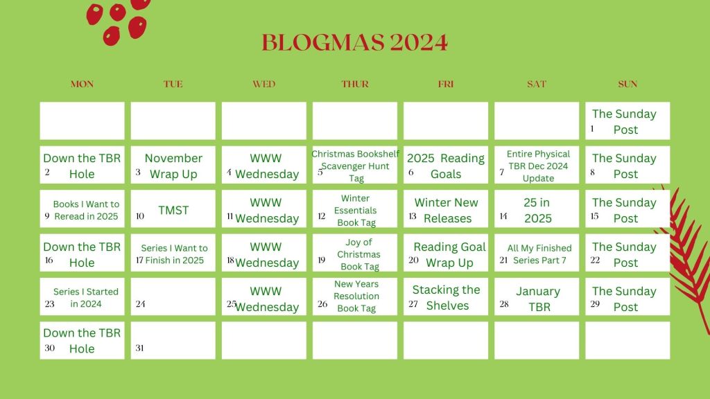 I have a Down the TBR Hole post for Monday, most likely a WWW Wednesday this week, the I Dare You Book Tag on Thursday, and my December TBR on Friday with some readathons attatched.